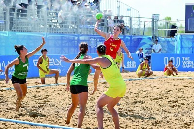 沙滩手球起源于20世纪90年代的意大利,由传统手球衍生而来,2001年首次成为世界运动会比赛项目。沙滩手球与室内手球的奥运会竞赛规则相似,但比赛场地是松软沙地。为了提升比赛的观赏性,除了常规射门得1分外,沙滩手球鼓励运动员采用花式进球,无论是空中转体射门,还是空中接力射门,都会被记作2分。进球是否具有创造力,是沙滩手球得高分的重要标准。